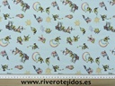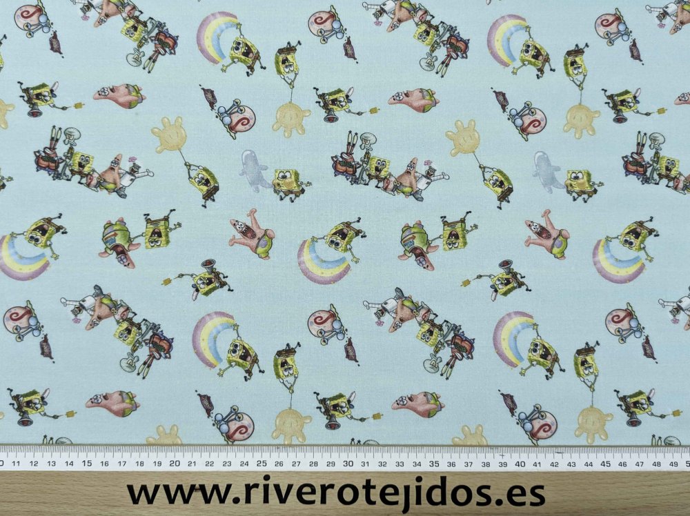 Algodón con fondo en color verde agua y estampado de Bob esponja en color amarillo y arcoiris. Tacto suave y agradable.